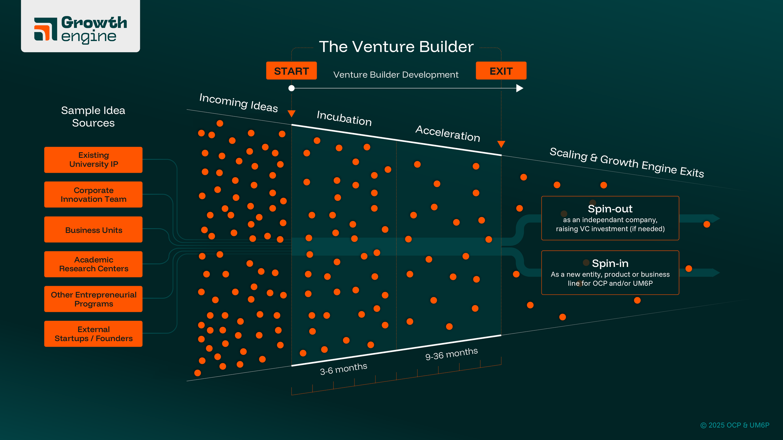 The Growth Engine team receives ideas from a variety of sources and regularly green-lights the most promising for entry into the Venture Builder. The Incubate stage concludes with a board pitch, where the team must demonstrate sufficient progress and validation to advance to the Accelerate stage. Ventures that successfully complete Accelerate will exit the program and launch as independent businesses inside or outside of the organization.